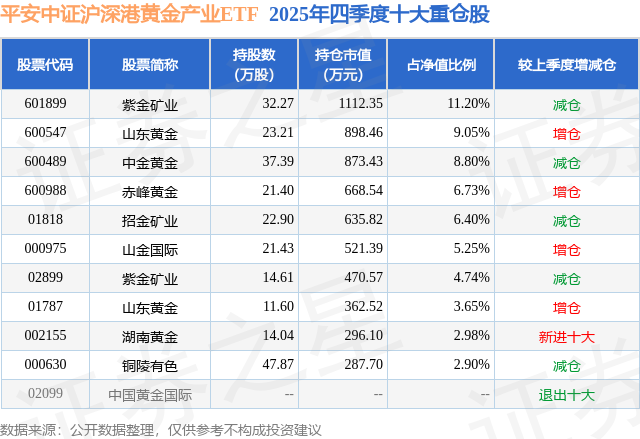 平安中证沪深港黄金产业ETF基金成立于2024年6月5日,基金经理为李严,基金跟踪标的为中证沪深港黄金产业股票指数,成立以来超额回报为22.38%,近一个月超额回报为7.58%。最新披露的基金持仓数据显示,截止2025年12月31日,该基金第一大重仓股为紫金矿业(601899),持股占比为11.2%。