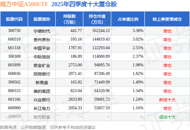 南方中证A500ETF基金成立于2024年9月25日,基金经理为朱恒红,基金跟踪标的为中证A500指数,成立以来超额回报为-20.77%,近一个月超额回报为0.02%。最新披露的基金持仓数据显示,截止2025年12月31日,该基金第一大重仓股为宁德时代(300750),持股占比为3.38%。