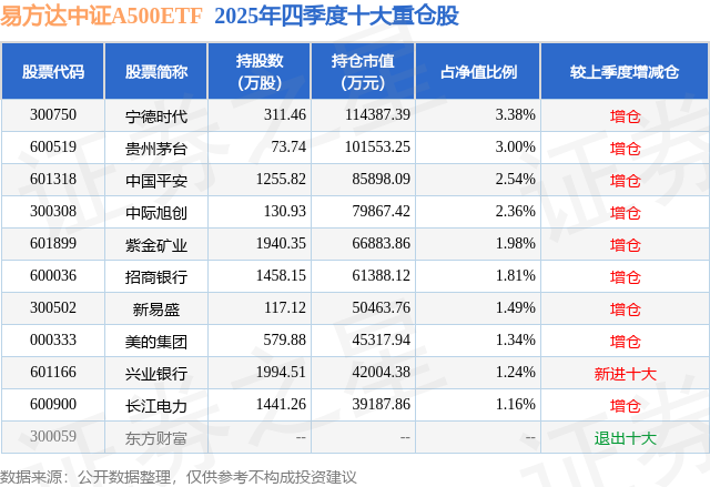 易方达中证A500ETF基金成立于2024年11月12日,基金经理为庞亚平,基金跟踪标的为中证A500指数,成立以来超额回报为7.04%,近一个月超额回报为0.05%。最新披露的基金持仓数据显示,截止2025年12月31日,该基金第一大重仓股为宁德时代(300750),持股占比为3.38%。