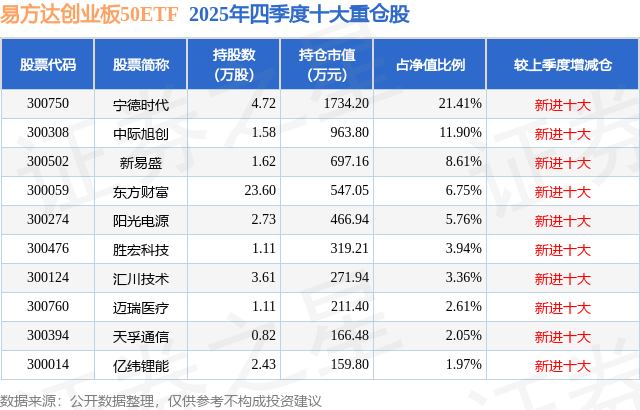 易方达创业板50ETF基金成立于2025年8月13日,基金经理为李博扬,基金跟踪标的为创业板50指数,成立以来超额回报为-10.91%,近一个月超额回报为-0.02%。最新披露的基金持仓数据显示,截止2025年12月31日,该基金第一大重仓股为宁德时代(300750),持股占比为21.41%。