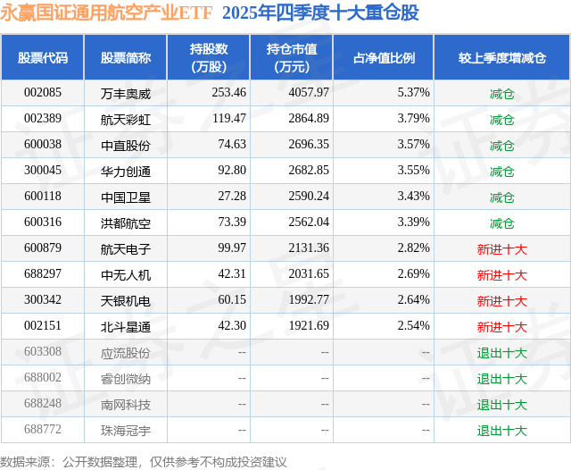 永赢国证通用航空产业ETF基金成立于2025年1月2日,基金经理为刘庭宇 张璐,基金跟踪标的为国证通用航空产业指数,成立以来超额回报为9.73%,近一个月超额回报为-0.01%。最新披露的基金持仓数据显示,截止2025年12月31日,该基金第一大重仓股为万丰奥威(002085),持股占比为5.37%。
