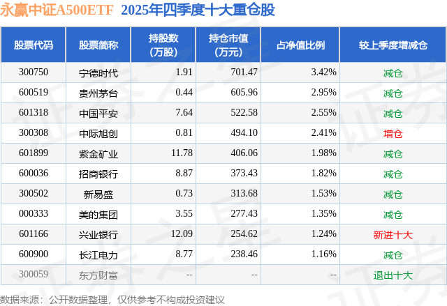 永赢中证A500ETF基金成立于2025年1月24日,基金经理为刘庭宇 蔡路平,基金跟踪标的为中证A500指数,成立以来超额回报为-0.29%,近一个月超额回报为0.04%。最新披露的基金持仓数据显示,截止2025年12月31日,该基金第一大重仓股为宁德时代(300750),持股占比为3.42%。