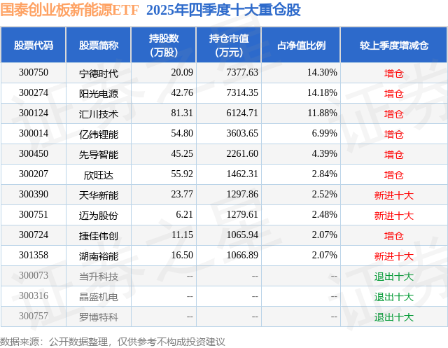 国泰创业板新能源ETF基金成立于2025年5月28日,基金经理为麻绎文,基金跟踪标的为创业板新能源指数,成立以来超额回报为-1.88%,近一个月超额回报为-0.05%。最新披露的基金持仓数据显示,截止2025年12月31日,该基金第一大重仓股为宁德时代(300750),持股占比为14.3%。