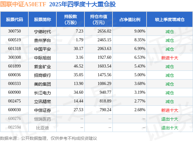 国联中证A50ETF基金成立于2025年3月26日,基金经理为杜超,基金跟踪标的为中证A50指数,成立以来超额回报为14.34%,近一个月超额回报为0.32%。最新披露的基金持仓数据显示,截止2025年12月31日,该基金第一大重仓股为宁德时代(300750),持股占比为9.0%。