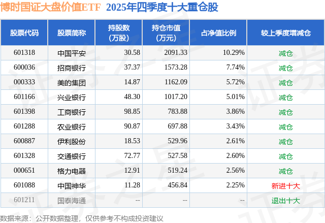 博时国证大盘价值ETF基金成立于2025年4月3日,基金经理为王祥,基金跟踪标的为国证大盘价值指数,成立以来超额回报为6.22%,近一个月超额回报为0.31%。最新披露的基金持仓数据显示,截止2025年12月31日,该基金第一大重仓股为中国平安(601318),持股占比为10.29%。