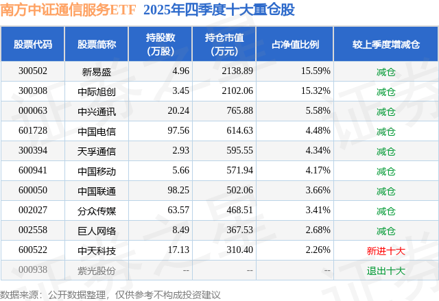 南方中证通信服务ETF基金成立于2023年7月28日,基金经理为李佳亮,基金跟踪标的为中证通信服务指数,成立以来超额回报为-2.91%,近一个月超额回报为-0.1%。最新披露的基金持仓数据显示,截止2025年12月31日,该基金第一大重仓股为新易盛(300502),持股占比为15.59%。