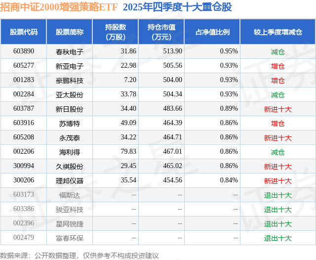 招商中证2000增强策略ETF基金成立于2024年6月19日,基金经理为邓童,基金跟踪标的为中证2000指数,成立以来超额回报为42.84%,近一个月超额回报为0.82%。最新披露的基金持仓数据显示,截止2025年12月31日,该基金第一大重仓股为春秋电子(603890),持股占比为0.95%。