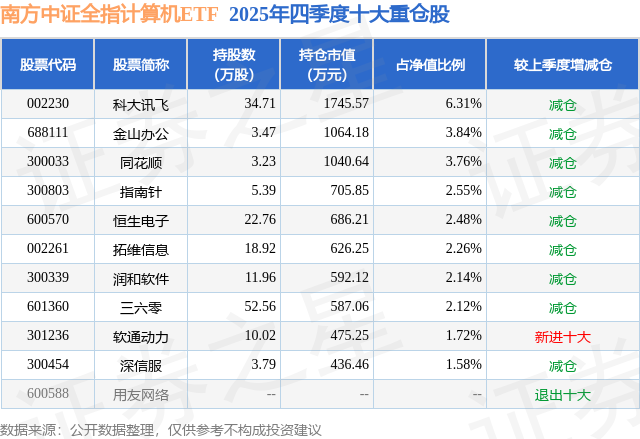 南方中证全指计算机ETF基金成立于2024年3月7日,基金经理为潘水洋,基金跟踪标的为中证全指计算机指数,成立以来超额回报为1.37%,近一个月超额回报为-0.06%。最新披露的基金持仓数据显示,截止2025年12月31日,该基金第一大重仓股为科大讯飞(002230),持股占比为6.31%。