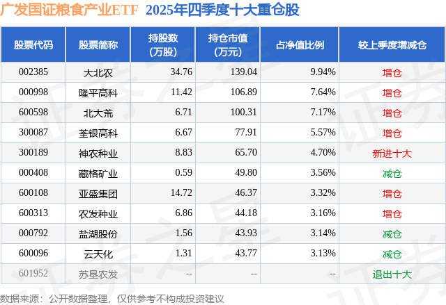 广发国证粮食产业ETF基金成立于2024年8月8日,基金经理为陆志明,基金跟踪标的为国证粮食产业指数,成立以来超额回报为-1.48%,近一个月超额回报为-0.08%。最新披露的基金持仓数据显示,截止2025年12月31日,该基金第一大重仓股为大北农(002385),持股占比为9.94%。