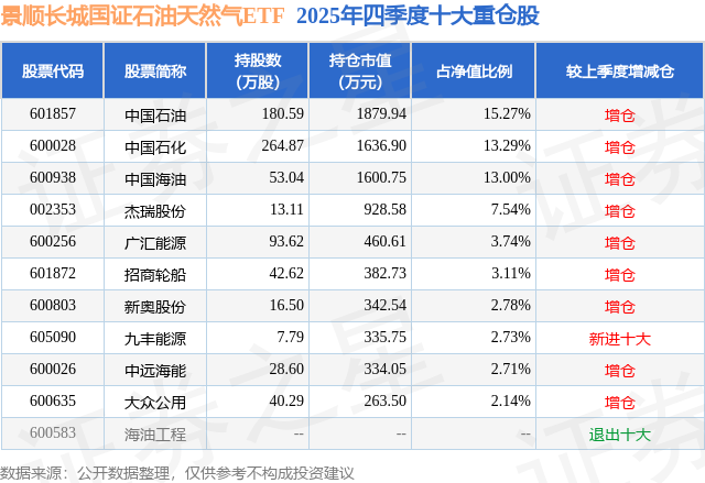 景顺长城国证石油天然气ETF基金成立于2024年5月23日,基金经理为金璜,基金跟踪标的为国证石油天然气指数,成立以来超额回报为4.6%,近一个月超额回报为-0.21%。最新披露的基金持仓数据显示,截止2025年12月31日,该基金第一大重仓股为中国石油(601857),持股占比为15.27%。