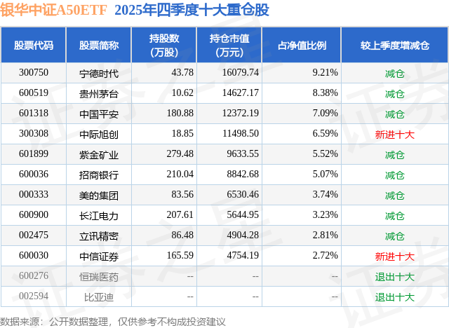 银华中证A50ETF基金成立于2024年3月6日,基金经理为王帅 张亦驰,基金跟踪标的为中证A50指数,成立以来超额回报为5.41%,近一个月超额回报为0.16%。最新披露的基金持仓数据显示,截止2025年12月31日,该基金第一大重仓股为宁德时代(300750),持股占比为9.21%。