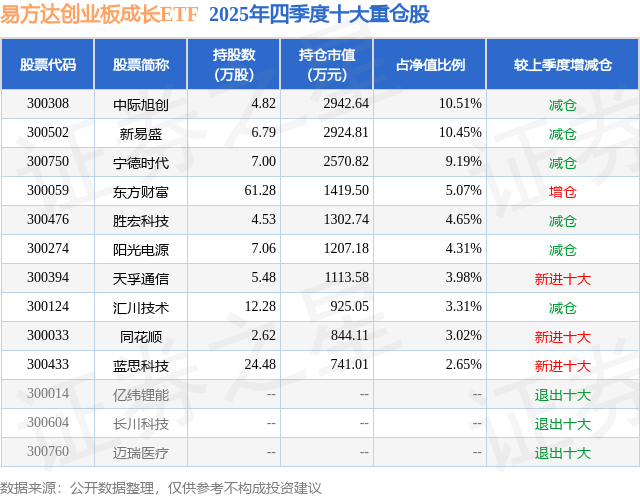 易方达创业板成长ETF基金成立于2024年5月8日,基金经理为刘文魁,基金跟踪标的为创业板成长指数,成立以来超额回报为12.11%,近一个月超额回报为0.02%。最新披露的基金持仓数据显示,截止2025年12月31日,该基金第一大重仓股为中际旭创(300308),持股占比为10.51%。