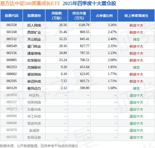 易方达中证500质量成长ETF基金成立于2021年12月17日,基金经理为伍臣东,基金跟踪标的为中证500质量成长指数,成立以来超额回报为20.68%,近一个月超额回报为0.29%。最新披露的基金持仓数据显示,截止2025年12月31日,该基金第一大重仓股为巨人网络(002558),持股占比为3.26%。