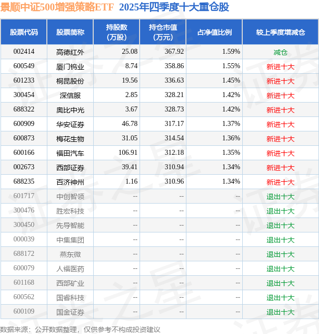 景顺中证500增强策略ETF基金成立于2021年12月13日,基金经理为张晓南 郭琳,基金跟踪标的为中证500指数,成立以来超额回报为8.8%,近一个月超额回报为-1.83%。最新披露的基金持仓数据显示,截止2025年12月31日,该基金第一大重仓股为高德红外(002414),持股占比为1.59%。