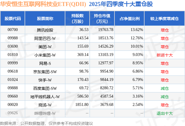 华安恒生互联网科技业ETF(QDII)基金成立于2023年1月17日,基金经理为倪斌,基金跟踪标的为恒生互联网科技业指数,成立以来超额回报为-4.51%,近一个月超额回报为-0.85%。最新披露的基金持仓数据显示,截止2025年12月31日,该基金第一大重仓股为腾讯控股(00700),持股占比为13.62%。
