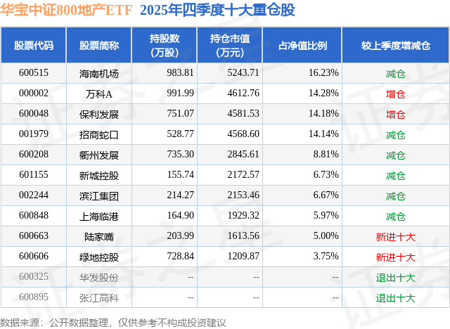 华宝中证800地产ETF基金成立于2021年11月4日,基金经理为蒋俊阳,基金跟踪标的为中证800地产指数,成立以来超额回报为1.8%,近一个月超额回报为-0.03%。最新披露的基金持仓数据显示,截止2025年12月31日,该基金第一大重仓股为海南机场(600515),持股占比为16.23%。