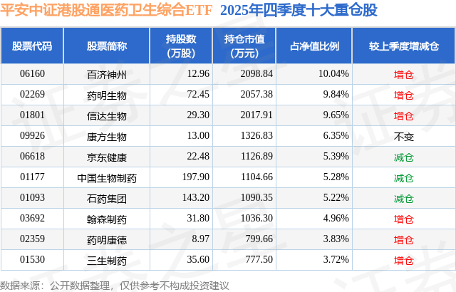 平安中证港股通医药卫生综合ETF基金成立于2021年12月16日,基金经理为翁欣,基金跟踪标的为中证港股通医药卫生综合港元指数,成立以来超额回报为-20.71%,近一个月超额回报为-1.09%。最新披露的基金持仓数据显示,截止2025年12月31日,该基金第一大重仓股为百济神州(06160),持股占比为10.04%。