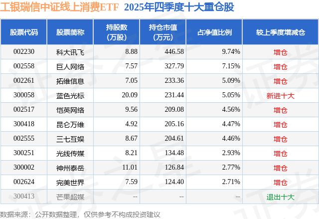 工银瑞信中证线上消费ETF基金成立于2021年6月11日,基金经理为杨广钊,基金跟踪标的为中证线上消费主题指数,成立以来超额回报为5.74%,近一个月超额回报为-0.38%。最新披露的基金持仓数据显示,截止2025年12月31日,该基金第一大重仓股为科大讯飞(002230),持股占比为9.74%。