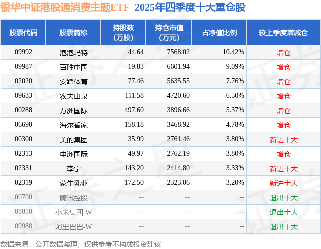 银华中证港股通消费主题ETF基金成立于2021年5月25日,基金经理为李宜璇,基金跟踪标的为中证港股通消费主题港元指数,成立以来超额回报为-3.15%,近一个月超额回报为-0.74%。最新披露的基金持仓数据显示,截止2025年12月31日,该基金第一大重仓股为泡泡玛特(09992),持股占比为10.42%。