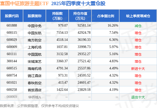 富国中证旅游主题ETF基金成立于2021年7月15日,基金经理为曹璐迪 殷钦怡,基金跟踪标的为中证旅游主题指数,成立以来超额回报为1.07%,近一个月超额回报为-0.03%。最新披露的基金持仓数据显示,截止2025年12月31日,该基金第一大重仓股为中国中免(601888),持股占比为16.26%。