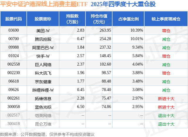 平安中证沪港深线上消费主题ETF基金成立于2021年11月9日,基金经理为刘洁倩,基金跟踪标的为中证沪港深线上消费主题人民币指数,成立以来超额回报为-52.73%,近一个月超额回报为-1.72%。最新披露的基金持仓数据显示,截止2025年12月31日,该基金第一大重仓股为美团-W(03690),持股占比为10.39%。