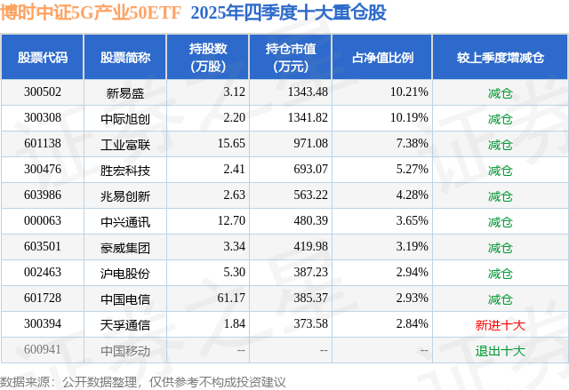 博时中证5G产业50ETF基金成立于2020年3月27日,基金经理为尹浩,基金跟踪标的为中证5G产业50指数,成立以来超额回报为45.4%,近一个月超额回报为0.06%。最新披露的基金持仓数据显示,截止2025年12月31日,该基金第一大重仓股为新易盛(300502),持股占比为10.21%。