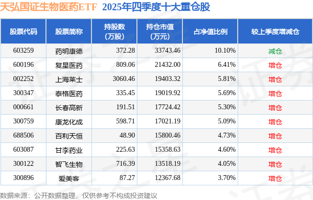 天弘国证生物医药ETF基金成立于2021年6月24日,基金经理为贺雨轩,基金跟踪标的为国证生物医药指数,成立以来超额回报为4.47%,近一个月超额回报为-0.02%。最新披露的基金持仓数据显示,截止2025年12月31日,该基金第一大重仓股为药明康德(603259),持股占比为10.1%。