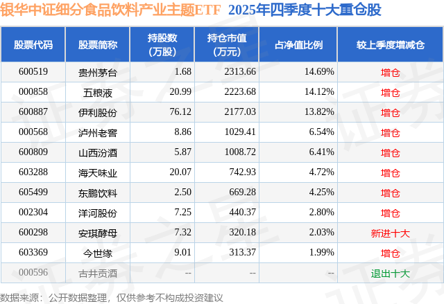 银华中证细分食品饮料产业主题ETF基金成立于2021年10月26日,基金经理为李宜璇,基金跟踪标的为细分食品,成立以来超额回报为5.54%,近一个月超额回报为0.0%。最新披露的基金持仓数据显示,截止2025年12月31日,该基金第一大重仓股为贵州茅台(600519),持股占比为14.69%。