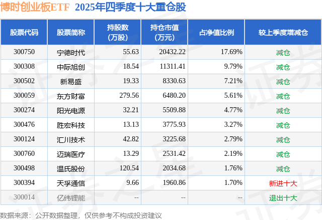 博时创业板ETF基金成立于2011年6月10日,基金经理为尹浩,基金跟踪标的为创业板指数(价格),成立以来超额回报为3.79%,近一个月超额回报为0.0%。最新披露的基金持仓数据显示,截止2025年12月31日,该基金第一大重仓股为宁德时代(300750),持股占比为17.69%。