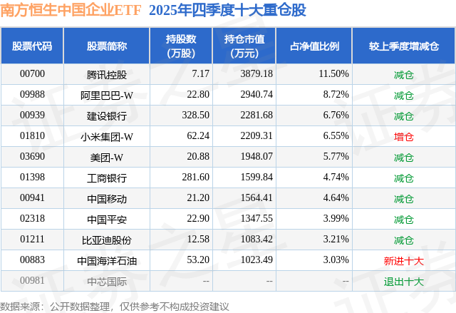 南方恒生中国企业ETF基金成立于2018年2月8日,基金经理为孙伟,基金跟踪标的为恒生中国企业指数,成立以来超额回报为30.41%,近一个月超额回报为-0.98%。最新披露的基金持仓数据显示,截止2025年12月31日,该基金第一大重仓股为腾讯控股(00700),持股占比为11.5%。