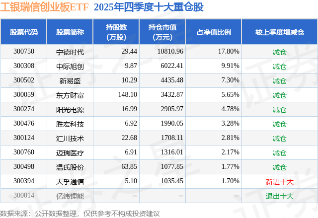 工银瑞信创业板ETF基金成立于2017年12月25日,基金经理为赵栩,基金跟踪标的为创业板指数(价格),成立以来超额回报为13.88%,近一个月超额回报为0.04%。最新披露的基金持仓数据显示,截止2025年12月31日,该基金第一大重仓股为宁德时代(300750),持股占比为17.8%。
