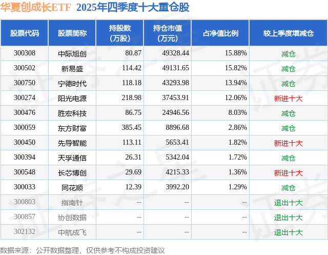 华夏创成长ETF基金成立于2019年6月21日,基金经理为荣膺,基金跟踪标的为创业板动量成长指数,成立以来超额回报为-4.88%,近一个月超额回报为0.06%。最新披露的基金持仓数据显示,截止2025年12月31日,该基金第一大重仓股为中际旭创(300308),持股占比为15.88%。