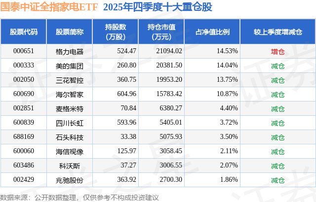 国泰中证全指家电ETF基金成立于2020年2月27日,基金经理为苗梦羽,基金跟踪标的为中证全指家用电器指数,成立以来超额回报为23.37%,近一个月超额回报为0.34%。最新披露的基金持仓数据显示,截止2025年12月31日,该基金第一大重仓股为格力电器(000651),持股占比为14.53%。