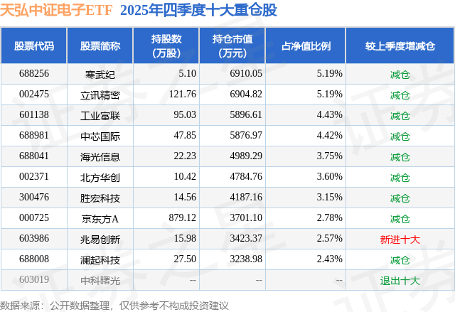 天弘中证电子ETF基金成立于2020年2月27日,基金经理为洪明华,基金跟踪标的为中证电子指数,成立以来超额回报为42.73%,近一个月超额回报为0.0%。最新披露的基金持仓数据显示,截止2025年12月31日,该基金第一大重仓股为寒武纪(688256),持股占比为5.19%。