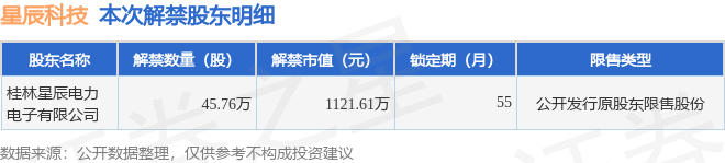 证券之星消息,根据市场公开信息整理,星辰科技(920885)于1月27日将有45.76万股限售股份解禁,为公司公开发行原股东限售股份,占公司总股本0.27%。(本次数据根据历史公告整理得出,实际情况以上市公司最新公告为准)本次解禁后,公司还有8231.67万股限售股份,占总股本48.19%。具体如下图所示: