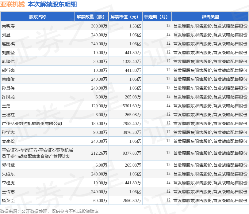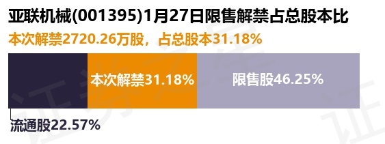 证券之星消息,根据市场公开信息整理,亚联机械(001395)于1月27日将有2720.26万股限售股份解禁,为公司首发原股东限售股份,首发战略配售股份,占公司总股本31.18%。(本次数据根据历史公告整理得出,实际情况以上市公司最新公告为准)最近一年内,该股累计解禁39.7万股,占总股本的0.46%。本次解禁后,公司还有4035.0万股限售股份,占总股本46.25%。具体如下图所示: