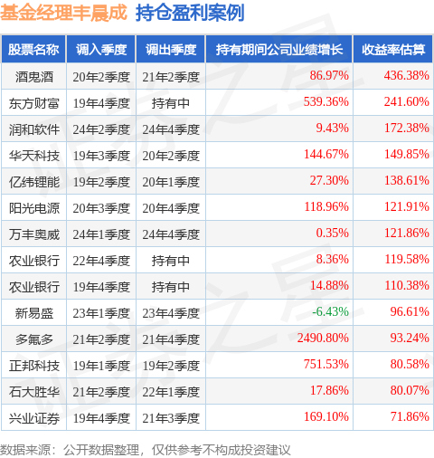 丰晨成管理的华宝中证1000指数A基金在23年1季度买入新易盛,在持有3个季度后在23年4季度卖出。持有期间的估算收益率为96.61%,持有期间新易盛在2022年到2023年的年报营业总收入降幅为6.43%。