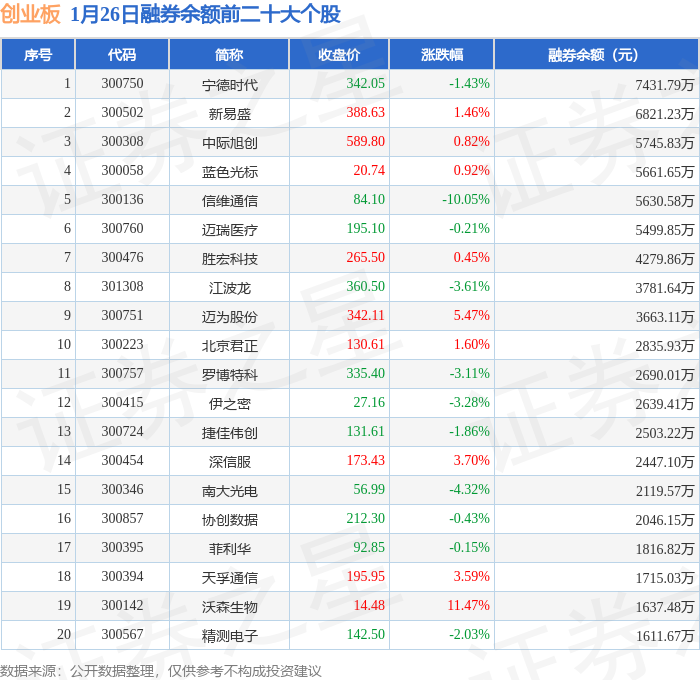 创业板融券余额前三分别为:宁德时代(300750)融券余额7431.79万元、新易盛(300502)融券余额6821.23万元、中际旭创(300308)融券余额5745.83万元,前20具体见下表:
