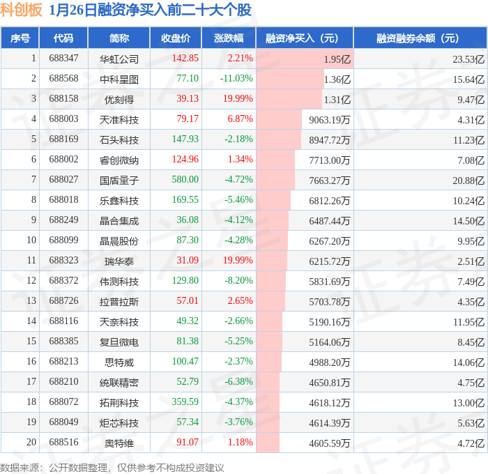 科创板融资净买入前三分别为:华虹公司(688347)融资净买入1.95亿元、中科星图(688568)融资净买入1.36亿元、优刻得(688158)融资净买入1.31亿元,前20具体见下表: