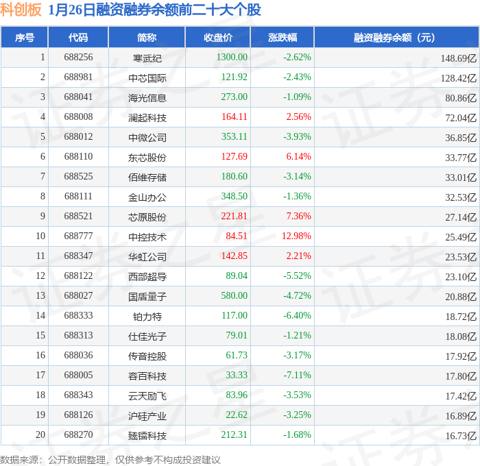 科创板融资融券余额前三分别为:寒武纪(688256)融资融券余额148.69亿元、中芯国际(688981)融资融券余额128.42亿元、海光信息(688041)融资融券余额80.86亿元,前20具体见下表: