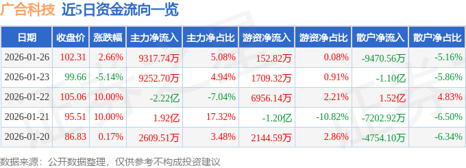证券之星消息,截至2026年1月26日收盘,广合科技(001389)报收于102.31元,上涨2.66%,换手率11.76%,成交量17.77万手,成交额18.35亿元。