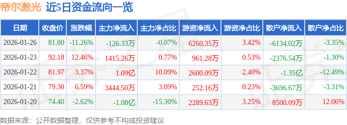 证券之星消息,截至2026年1月26日收盘,帝尔激光(300776)报收于81.8元,下跌11.26%,换手率12.9%,成交量21.67万手,成交额18.32亿元。