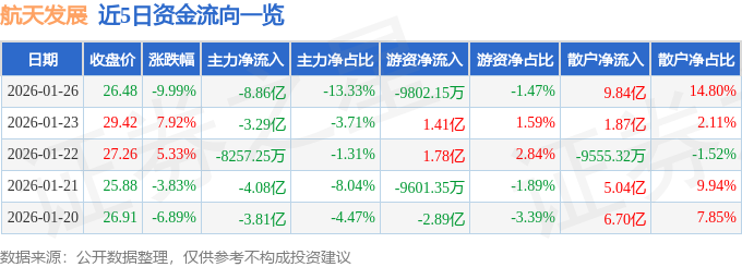 证券之星消息,截至2026年1月26日收盘,航天发展(000547)报收于26.48元,下跌9.99%,跌停,换手率15.39%,成交量244.58万手,成交额66.48亿元。