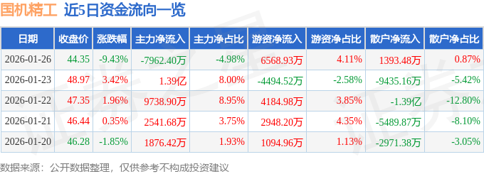证券之星消息,截至2026年1月26日收盘,国机精工(002046)报收于44.35元,下跌9.43%,换手率6.64%,成交量35.13万手,成交额15.98亿元。