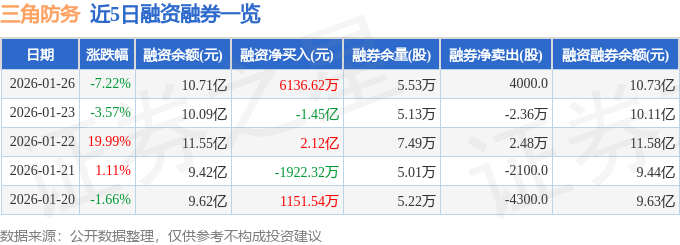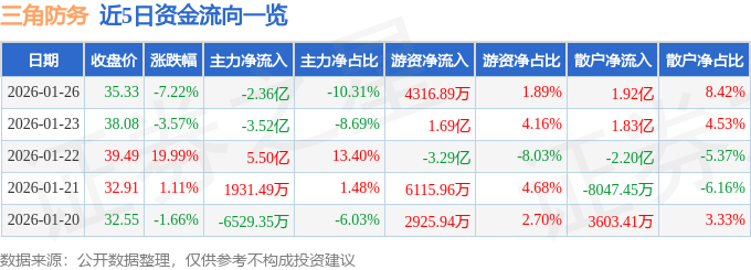 证券之星消息,截至2026年1月26日收盘,三角防务(300775)报收于35.33元,下跌7.22%,换手率11.91%,成交量63.3万手,成交额22.86亿元。