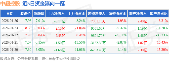 证券之星消息,截至2026年1月26日收盘,中超控股(002471)报收于7.96元,下跌7.01%,换手率34.0%,成交量456.5万手,成交额38.11亿元。