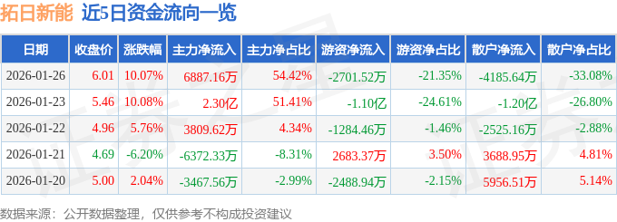 1月26日的资金流向数据方面,主力资金净流入6887.16万元,占总成交额54.42%,游资资金净流出2701.52万元,占总成交额21.35%,散户资金净流出4185.64万元,占总成交额33.08%。