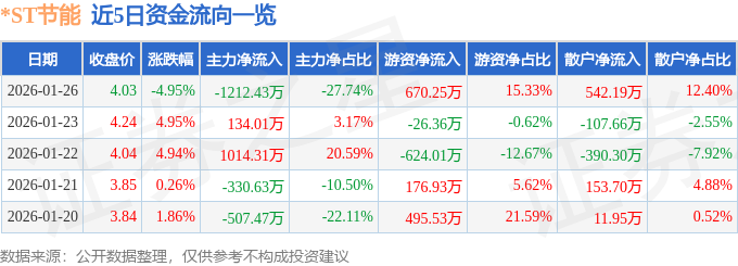 1月26日的资金流向数据方面,主力资金净流出1212.43万元,占总成交额27.74%,游资资金净流入670.25万元,占总成交额15.33%,散户资金净流入542.19万元,占总成交额12.4%。