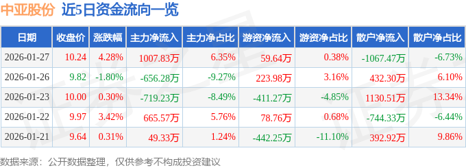 1月27日的资金流向数据方面,主力资金净流入1007.83万元,占总成交额6.35%,游资资金净流入59.64万元,占总成交额0.38%,散户资金净流出1067.47万元,占总成交额6.73%。