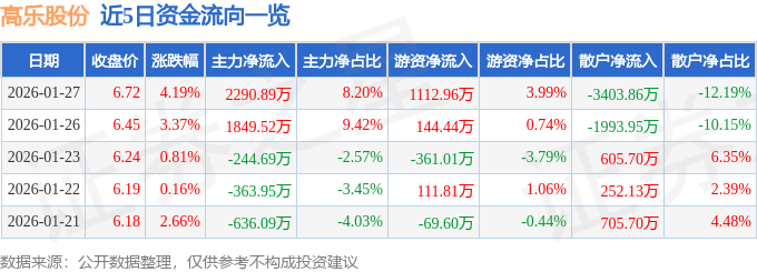 证券之星消息,截至2026年1月27日收盘,高乐股份(002348)报收于6.72元,上涨4.19%,换手率4.7%,成交量42.47万手,成交额2.79亿元。